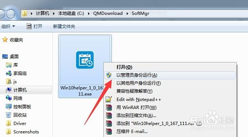 2:从打开的“下载目录”中,找到“深度技术win7升级助手”,右击选择“以管理员身份运行”项。