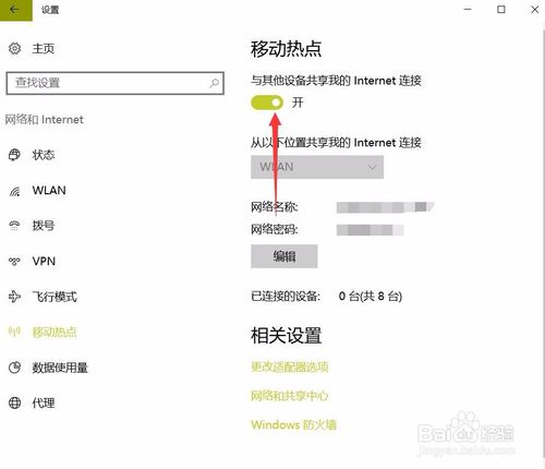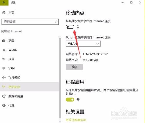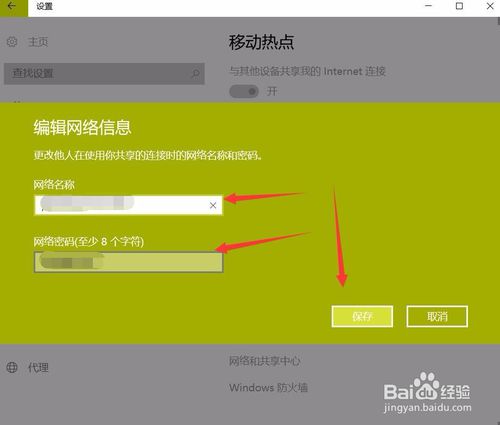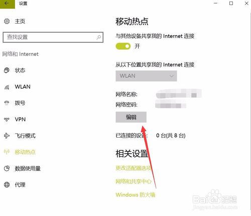 5:单击之后会显示绿色,如图所示,此时就已经成功共享电脑热点。并且会自动生成一个热点的名称以及密码,如果我们想要更改热点的名称以及密码的话,那么单击“编辑”按钮。