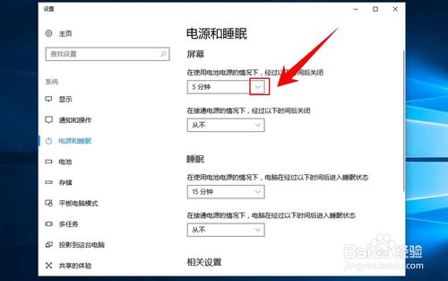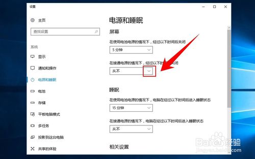 5:设置使用接通电源情况下的屏幕自动关闭时间,同样的点击图示位置的下拉箭头。