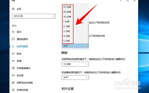 6:在接通电源的设置界面中,系统提供了25分钟-从不,总共10种屏幕关闭的时间选项,点击鼠标左键选择其中一种。
