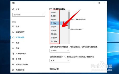 4:点击下拉箭头后就会出现一个时间选项的列表,系统提供了1分钟-30分钟总共9个时间选项,选择你希望的屏幕关闭时间选项。