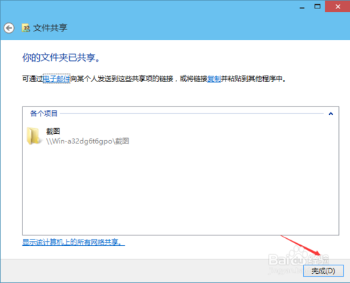 9:系统提示共享文件夹设置成功,点击完成。如下图所示。