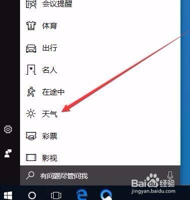 3:在小娜主界面中点击“天气”菜单项,如下图所示: