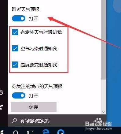 4:把“附近天气预报”下面的开关设置为“打开”,接着选中下面的“有意外天气时通知我”、“空气污染时通知我”、“温度骤变时通知我”三个复选框,如下图所示: