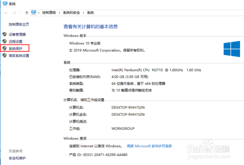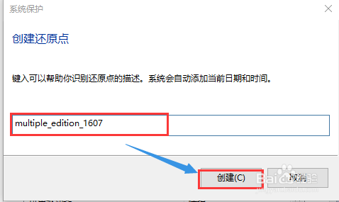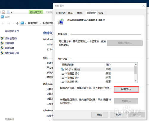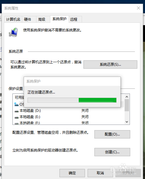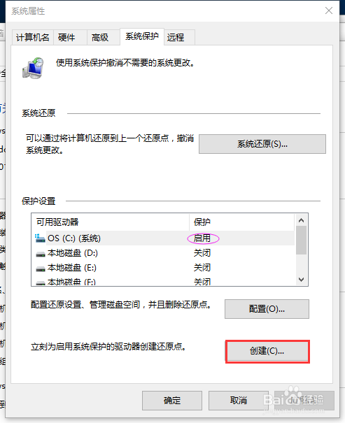 7:回到“系统属性”页面,此时C盘的保护状态已经变成”启用“,单击"创建“