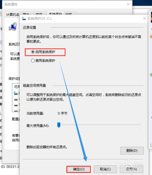 6:在下一个对话框中选择“启用系统保护”,单击“确定”