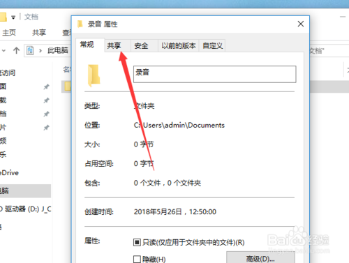 4:这样就会弹出了一个文件夹属性的界面当中,进行点击 共享 的选项。