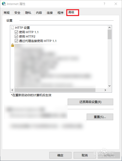 6:进入到高级设置后即可选择HTTP版本啦,在HTTP设置中,为了不同网页的兼容显示,我们一般勾选所有的HTTP版本,并勾选“通过代理连接使用HTTP”