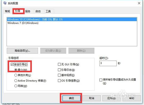 9:从打开的“系统配置”窗口中,切换到“引导”选项卡,勾选“安全引导”项,点击“确定”按钮,并重启一下计算机进入安全模式。