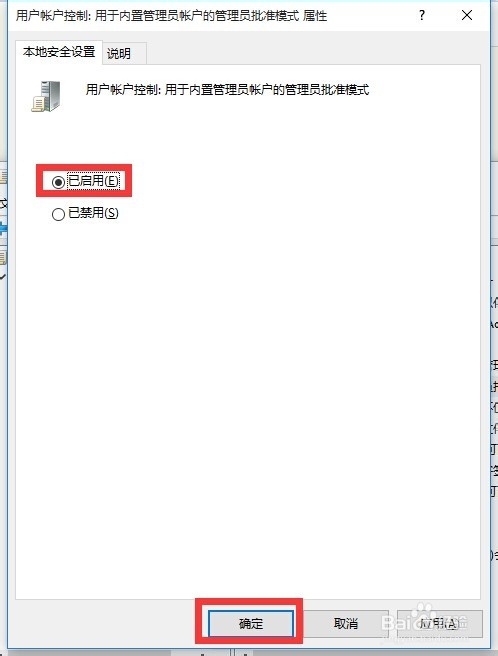 6:此时将打开“用户账户控制:用于内置管理员账户的管理员批准模式”属性窗口,勾选”已启用“项,点击”确定“按钮。如图所示: