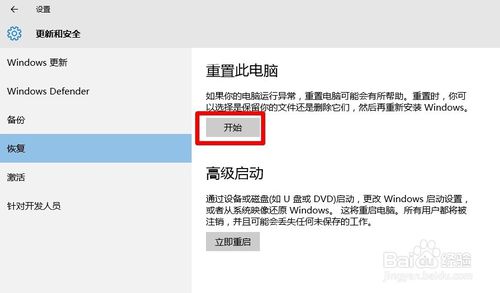 10:在“安全模式”界面中,依次进入“设置”-“更新和安全”界面中,切换到“恢复”选项卡,点击“重置此电脑”下方的“开始”按钮以重置系统,实现重启安装深度技术win7操作。
