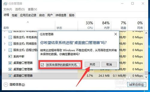 3:此时将弹出如图所示的“任务管理器”警告窗口,在此直接勾选“放弃未保存的数据并关闭”项,点击“关闭”按钮。
