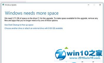 其实遇到这样的情况,微软已经作出了相对应的措施。当升级程序检测到C盘没有足够的剩余空间时,除了会提示用户手动清理外,还会提供另外两个选项: