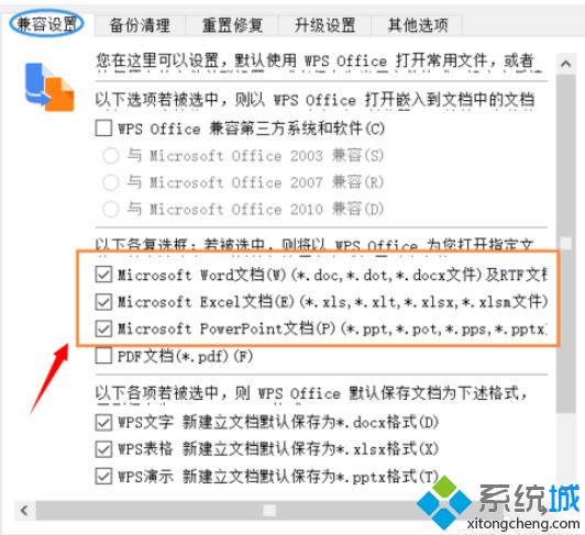 4、我们注意到在兼容设置对应的选项里,系统自动勾选了word、Excel等文档的自动打开方式为wps软件;