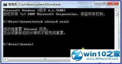 b.在命令提示符处键入 netsh winsock reset,然后按 Enter,重启电脑。