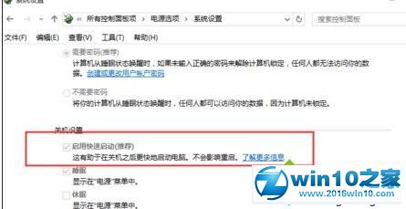 7、这是因为windows10关闭了休眠功能,所以“启用快速启动”功能也关闭了。以后如果我们想关闭“启用快速启动”功能的话,也很简单;
