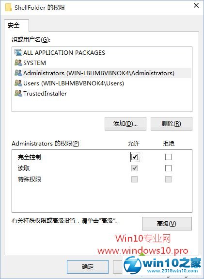 2、直接把Administrators组的权限修改为“完全控制”时,却又会弹出“windows安全”警告框,提示“无法保存对shellFolder权限所作的更改;