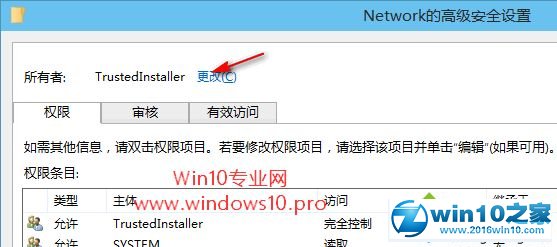 9、然后点击“确定”关闭“选择用户或组”窗口,回到“network的高级安全设置”窗口,你会发现“所有者”已经变成了你刚才输入的用户;