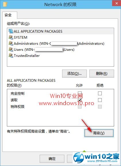 10、然后点击“确定”关闭“network的高级安全设置”窗口,回到“network的权限”设置窗口;