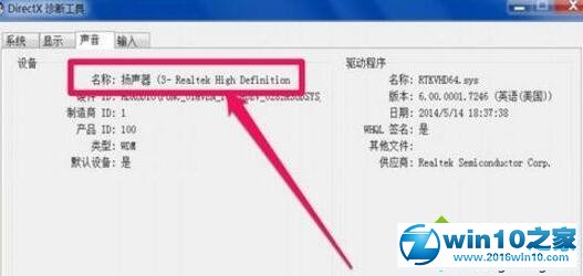4、在声音这个选项卡界面,其名称这一项,就是声卡型号,在这里,可以看到更多的信息,如数字签名,驱动程序名称,版本等等。