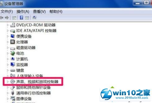 3、进入设备管理器窗口后,从所有设备中,找到“声音,视频和游戏控制器”这一项,由于系统版本不同,这个名字会有不同。