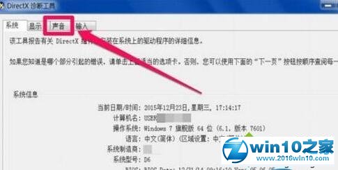 3、进入directx 诊断工具窗口后,默认为系统选项卡,需要选择“声音”这个选项卡。