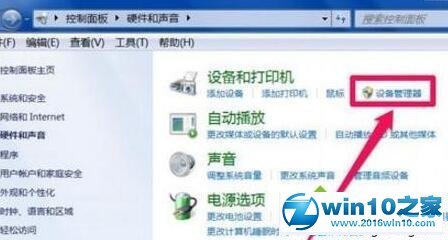 2、在硬件和声音窗口,到右侧界面,找到“设备和打印机”下的“设备管理器”这一项。