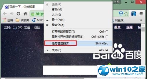 2、在Chrome浏览器的标题栏空白处右击鼠标,再在弹出的菜单中选择“任务管理器”。