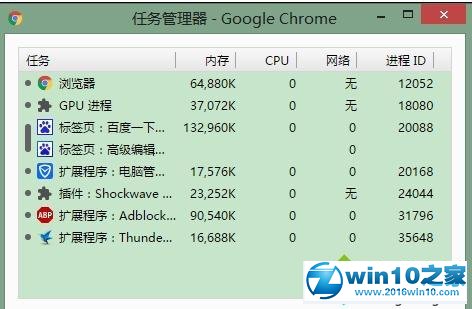 3、在打开的Chrome的任务管理器窗口中,我们可以查看到各个组件(例如,浏览器主进程、插件、扩展程序等)分别占用多少内存。
