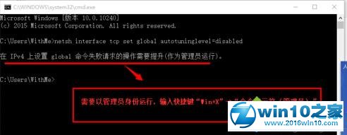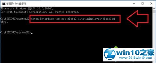 5、在弹出CMd命令提示符窗口后并输入“netsh interface tcp set global autotuninglevel=disabled”回车;