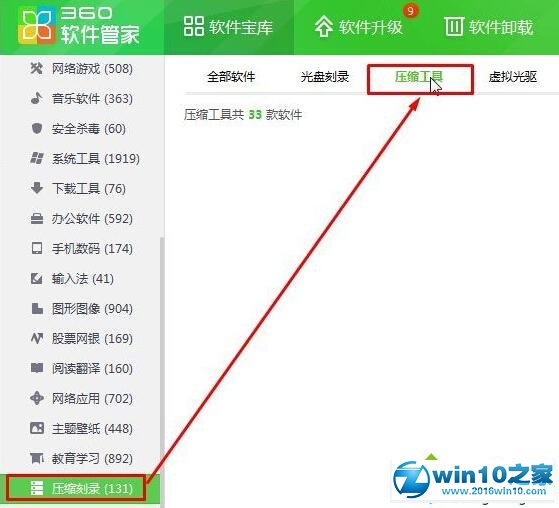 2、在软件管家界面左侧找到“压缩刻录”并点击,然后在右侧顶部选择“压缩工具”;