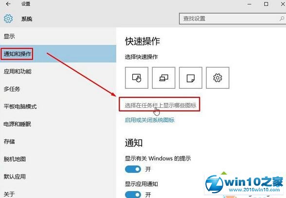 3、在“系统”界面左侧点击“通知和操作”,在右侧点击“选择在任务栏上显示哪些图标”;