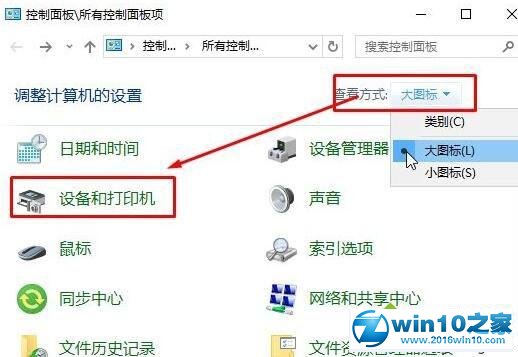 3、在控制面板右上角将查看方式修改为【大图标】,然后打开【设备和打印机】;