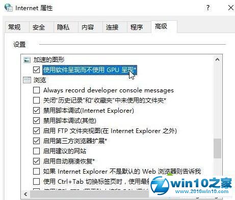 4、切换到【高级】选卡,在下面找到【加速的图形】,在下面勾选【使用软件呈现而不使用 GpU 呈现*】 点击应用并确定,重启浏览器即可解决问题!