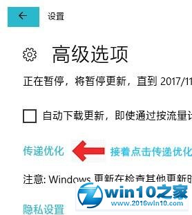 2、进入windows更新的高级选项后你可以看到有个名为传递优化的选项,这个传递优化选项就是p2p共享的,如图所示: