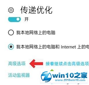 3、进入传递优化选项后你会再次看到个高级选项, 然后我们需要继续进入这里的高级选项进入最后的设置,如下图进行操作: