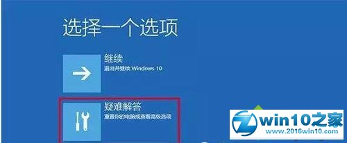 3、重启后,进入第一个选择画面,点击“疑难解答”;