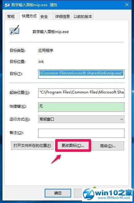 5、在打开的数学输入面板mip.exe 属性窗口,点击:更改图标(C)...;