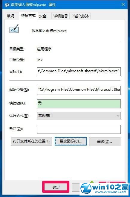 7、回到数学输入面板mip.exe 属性窗口,点击:应用 - 确定;