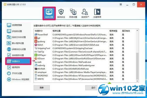 16、朋友们可以下载、安装【软媒魔方】,在软媒魔方的【设置大师】-【系统设置】-【快捷命令】中寻找【程序位置】,即创建快捷方式中的【对象位置(T)】,软媒魔方软件中记录下了本机安装的所有软件的程序位置。