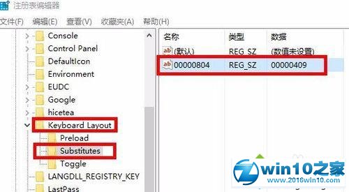 7、定位到HKEY_CURREnT_UsER/Keyboard Layout/substitutes,右侧空白处鼠标右键-新建“字符串值”,名称为 00000804,值为 00000409。同时确认下图3的定位设置是否一致,否则新建和修改成如下图2: