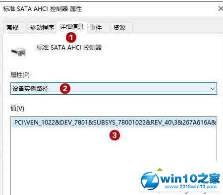 3. 点击“详细信息”标签,将“属性”栏修改为“设备实例路径”,记录下它的路径。