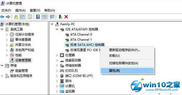 2. 展开节点“idE ATA/ATApi控制器”→“标准sATA AHCi控制器”,右击选择“属性”。