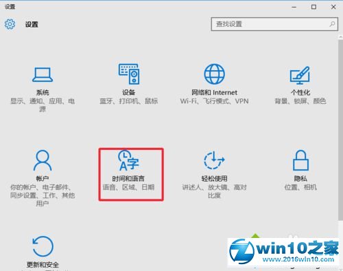 3、然后就来到了我们的设置面板,当然你也可以通过菜单直接打开设置,打开设置面板之后,找到”时间和语言“鼠标左键点击。
