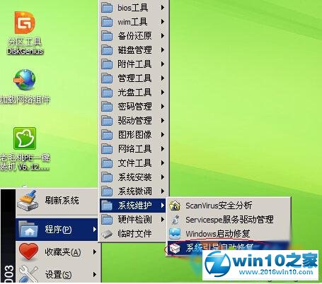 2、在pE中点击开始菜单,点击“程序”—“系统维护”—“系统引导自动修复”;