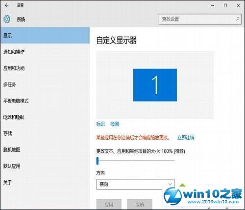 右键桌面——显示设置——滑块向左移动——调节到100%——应用。