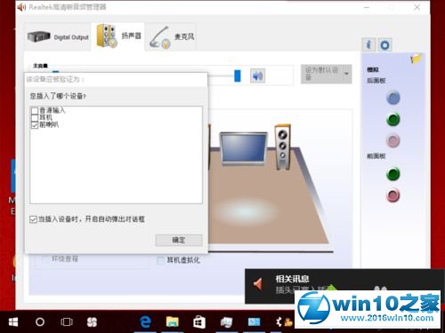 4、如果您插入的是音频设备——如:《电脑低音炮丶功率放大器丶信号放大设备》可以不用勾选(耳机)直接用默认的(前置喇叭)。