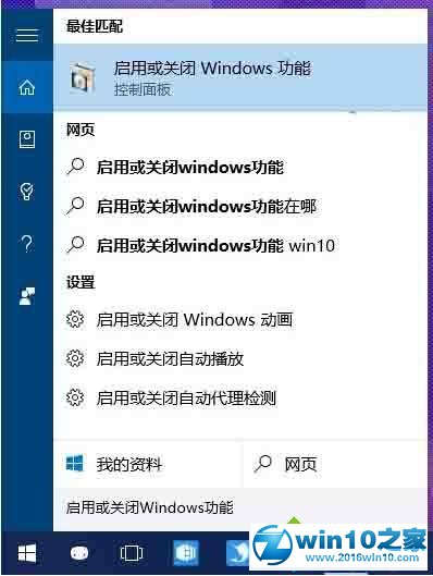 1、在任务栏搜索框中输入“启用或关闭windows功能”,打开找到的项目;
