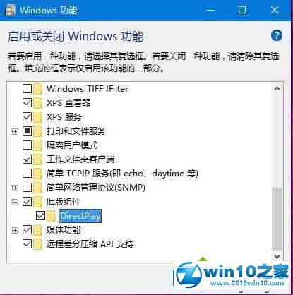 2、在windows功能中找到“旧版组件”,展开,勾选“directplay”功能,点击“确定”;