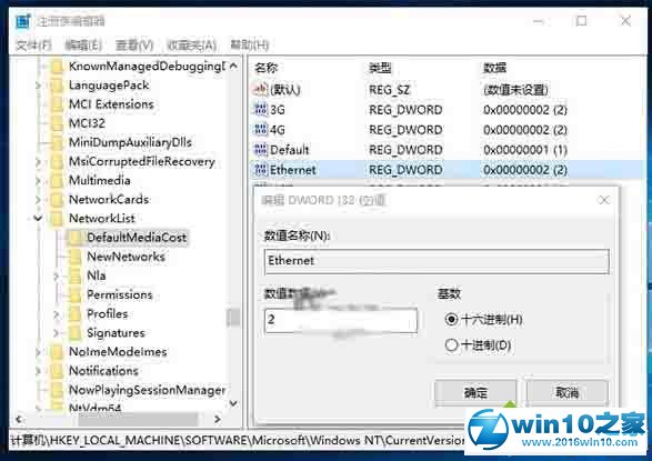 4、在右侧找到Ethernet,该项即为本地连接(以太网),双击,将其值修改为2;